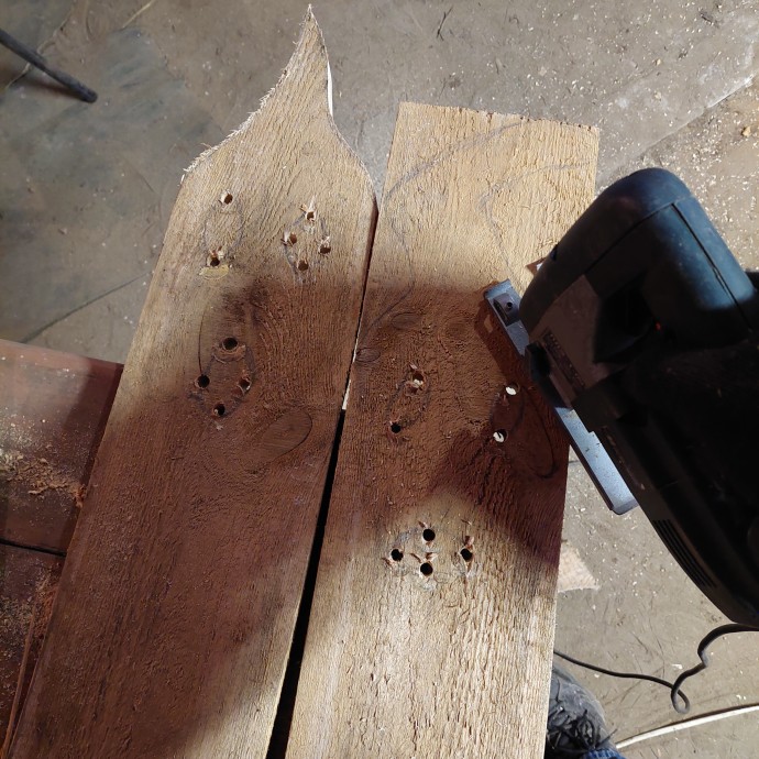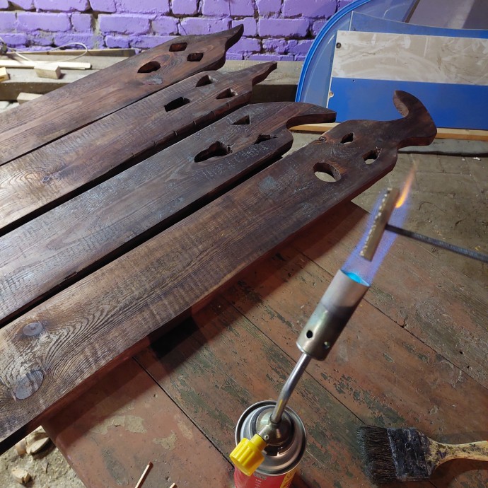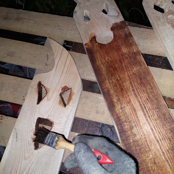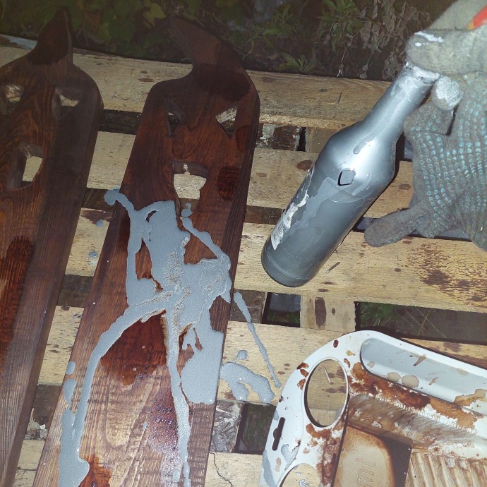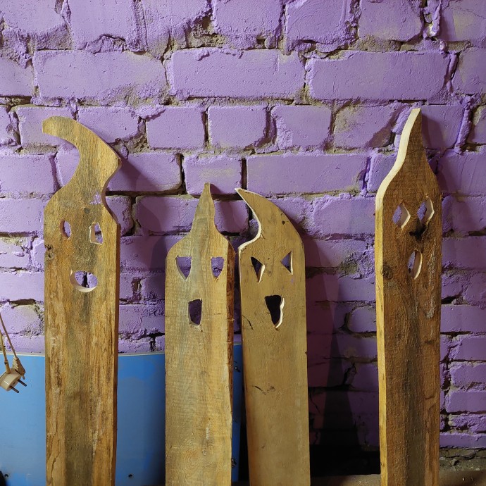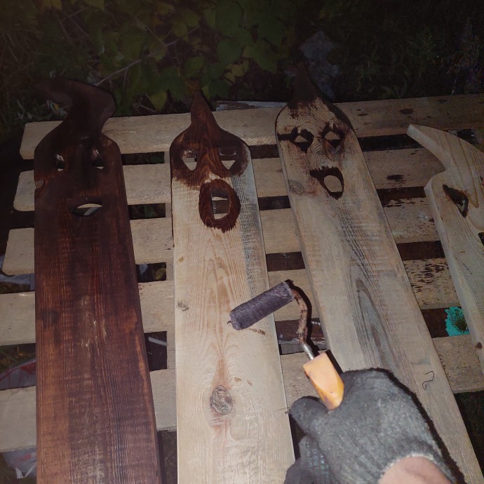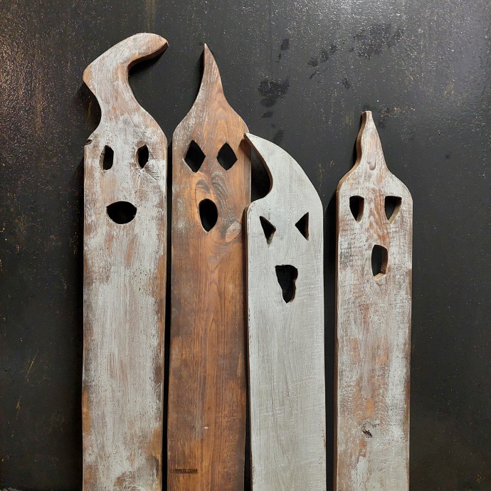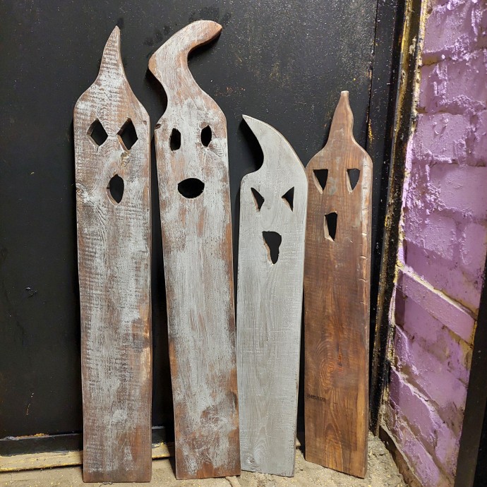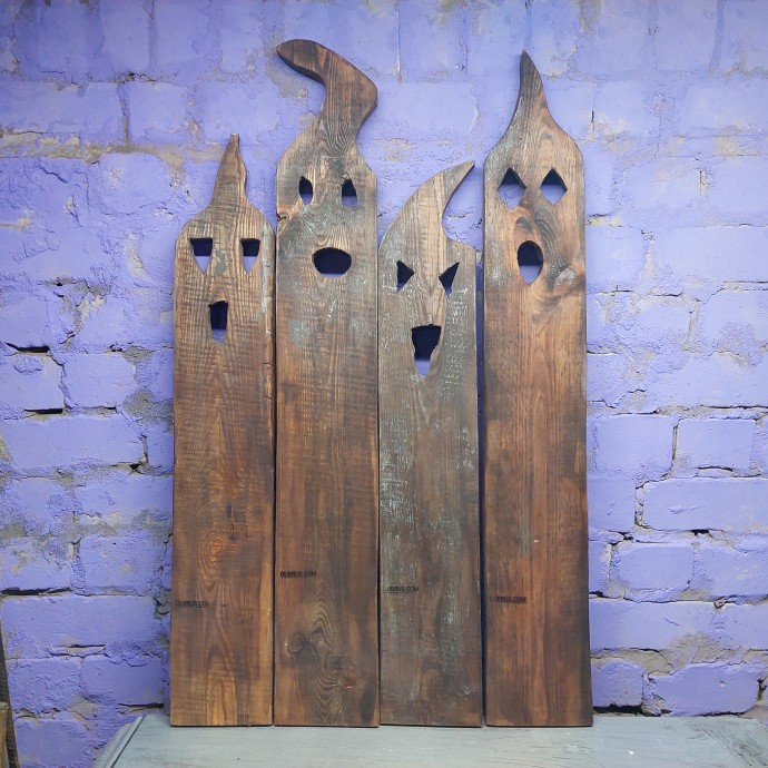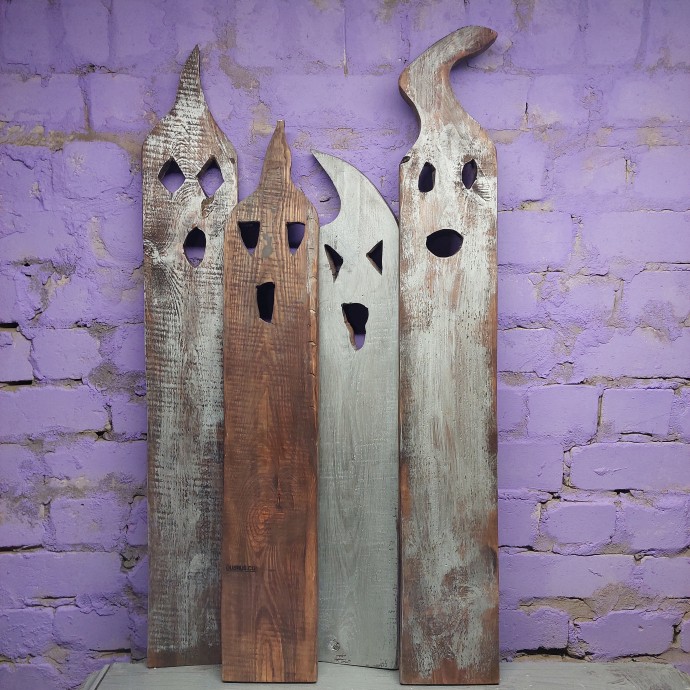 В преддверии Хэллоуина я решил создать нечто особенное для украшения. Взял доски, распилил их и начертил контуры приведений. Затем вырезал фигуры и покрасил морилкой. Когда тряс бутылку с серебрянкой, она лопнула и пролилась. Так получился один персонаж, полностью серебристый с одной стороны. Результат понравился: деревянные привидения получились пугающими и в то же время стильными. Теперь они добавляют атмосферу Хэллоуина и отлично вписываются в любой интерьер, как в доме, так и на улице.