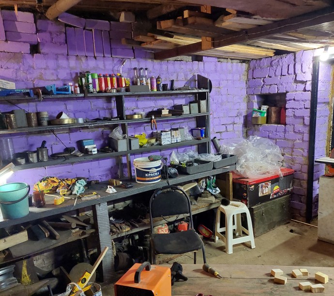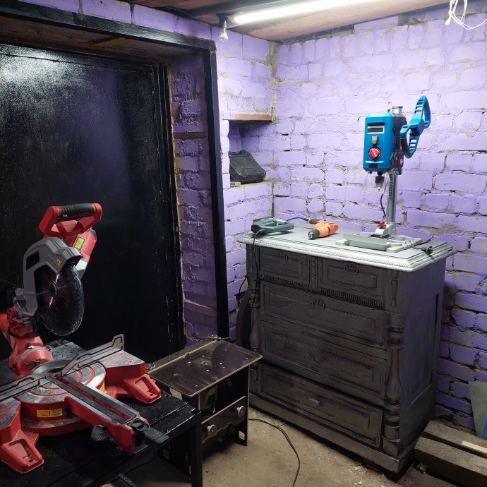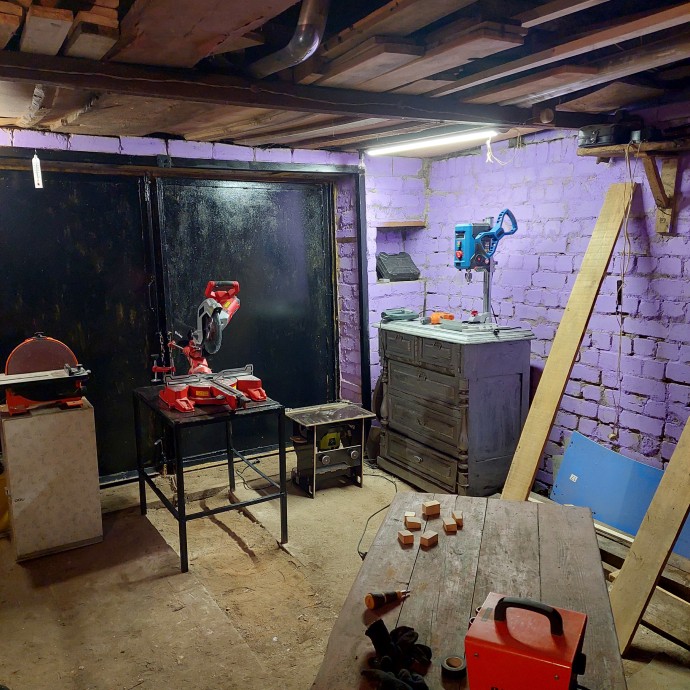 Мой гараж раньше был серым и унылым, с облезлыми желтыми воротами и кирпичными стенами, освещенными одной лампочкой. Я решил преобразить его: покрасил стены в фиолетовый, ворота в черный. Цвет выбрал нашару и удивился что мне понравился результат. Добавил освещение и купил новые станки. А после и комод попал под раздачу с помощью найденной в нем же бутылкой серебрянки. Теперь гараж светлый и уютный, что создает атмосферу для творчества!